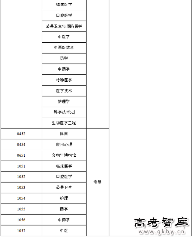 学硕方面:教育学下面对应的教育学、心理学、体育学;历史学下面对应的考古学、中国史、世界史;医学下面对应的基础医学、临床医学、口腔医学、公共卫生与预防医学、中医学、中西医结合、药学、中药学、特种医学、医学技术、护理学、科学技术史、生物医学工程考试科目均为三科。