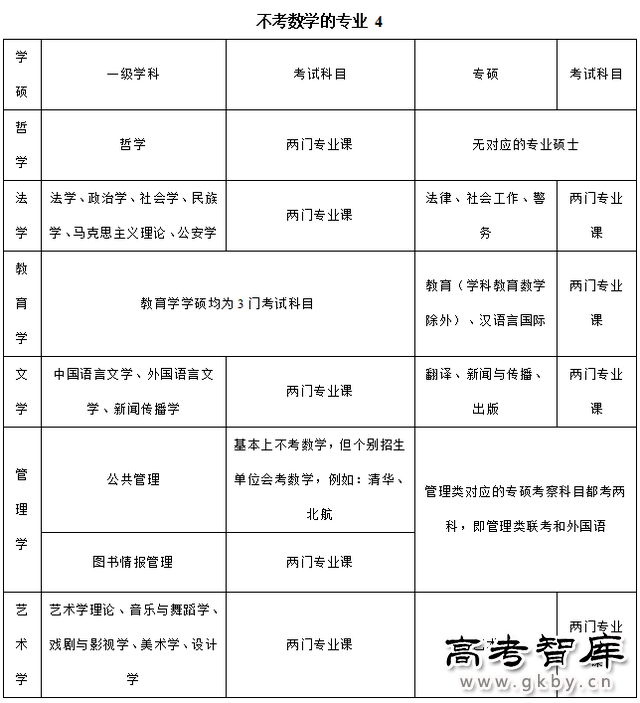 不考数学的专业主要集中在哲学、法学、文学、医学、艺术学等学科。不考数学的专业初试科目一般为政治、英语和两门专业课,其中政治、英语满分均为100分,两门业务课满分均为150分,总分为500分。